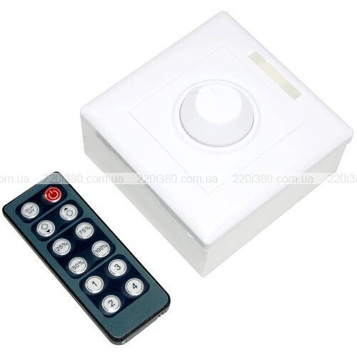 Димер OEM 16A-IR-12 використовується для плавного регулювання яскравості світла монохромних світлодіодних стрічок. Його потужність дорівнює 192 Вт, а сила струму на виході складає 16 А. Робоча напруга моделі – 12 В постійного струму. Спосіб монтажу на стіну – накладний, габарити виробу – 90х90х28 мм.