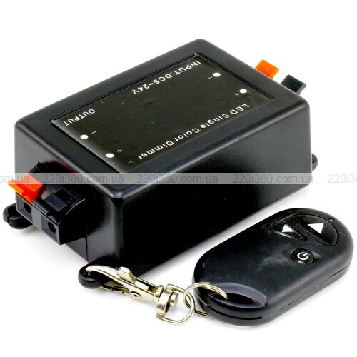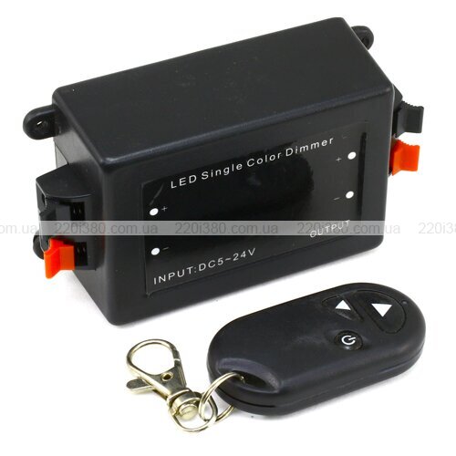 Димер OEM 8A-RF-3 призначений для плавного регулювання яскравості світіння світлодіодних стрічок. Максимально допустима потужність даного приладу дорівнює 96 Вт. Він має вихідну силу струму 8 А та працює під напругою 12 В. Габарити корпусу – 110х56х34 мм.