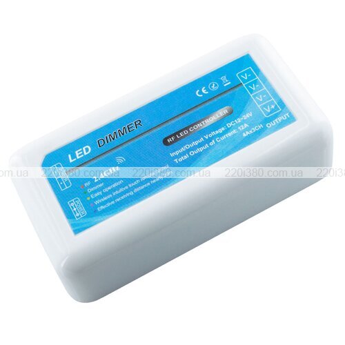 Димер OEM D-12A-2.4G-3zone використовується для плавного регулювання яскравості світла монохромних світлодіодних стрічок. Він має номінальну потужність 144 Вт та може працювати під напругою у діапазоні 12-24 В. Сила струму на виході складає 12 А – по 4 А на кожен з каналів пристрою. Розміри корпусу – 85х45 мм.