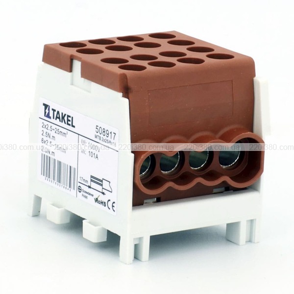 Клема розподільча MTB 2х25/6х16 з подвійною фіксацією, коричневий TAKEL