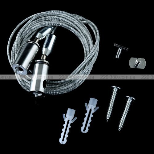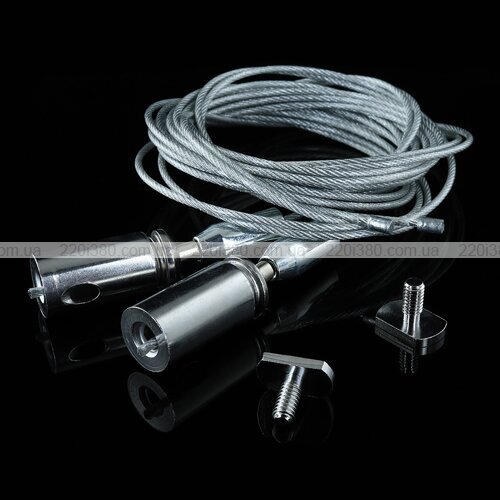 Цей комплект для підвісного кріплення алюмінієвого профілю світлодіодного підсвічування складається з кліпси, відрізка троса довжиною 1 метр, дюбеля і шурупа. Виріб виготовлено з металу.