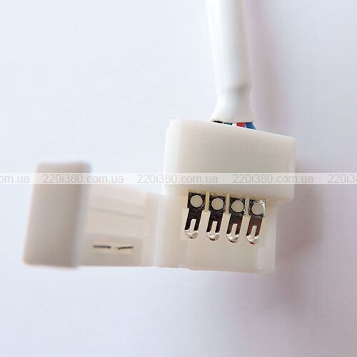 Даний конектор призначений для з'єднання відрізків світлодіодних стрічок. Він складається з чотирьохконтактної кліпси, дроту та 4 затискачів типу «тато». Виріб має ширину 10 мм і підходить для гнучких плат типу RGB.