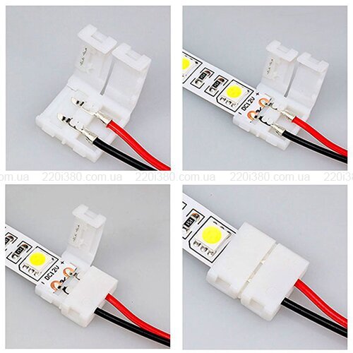 Цей конектор типу провідний «затискач-затискач» використовується для з'єднання відрізків світлодіодних стрічок. Виріб являє собою 2 кліпси з парою контактів, що мають ширину 10 мм.