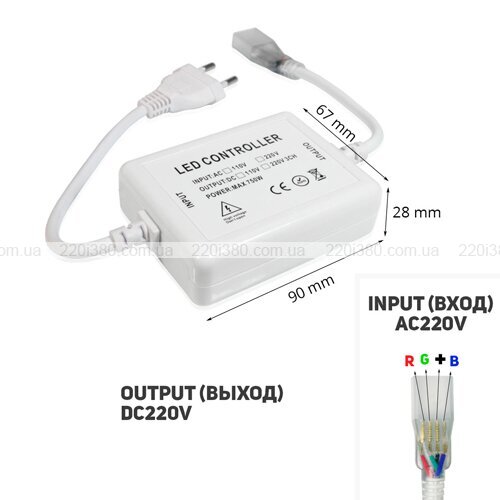 Контролер RGB 220В OEM 750W-RF-28 застосовується для віддаленого управління режимами світіння багатобарвної світлодіодної стрічки. Його максимальна потужність дорівнює 750 Вт, а вихідна сила струму становить 3,64 А. Таким чином, на кожен з трьох каналів пристрою доводиться по 1,21 А. Робоча напруга виробу – 220 В.
