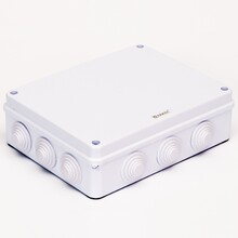 Призначення: для з'єднання і розгалуження електричних проводів і кабелю в умовах зовнішнього монтажу. Матеріал: АБС-пластик, ПВХ. Одиниця виміру (мін. норма відвантаження): штука. Робочі температури: від -30 до +60 °С. Температури монтажу: від -10 до +40 °С. Колір: світло-сірий. Якісний матеріал (АБС), стійкий до перепадів температур та інших впливів навколишнього середовища, забезпечує тривалий термін експлуатації коробки. М'які багаторівневі вводи-сальники з щільною посадкою в отвори збільшують ступінь герметизації внутрішнього простору коробки. Сальники міцно тримаються в отворах, люфт відсутній. Кожен ввід має п'ять варіантів діаметра отвору. Матеріал сальників залишається пластичним тривалий час. Ущільнювальна гумка між корпусом і кришкою по всьому периметру коробки значно збільшує ступінь пило і волого захисту.Кришка фіксується до корпусу коробки за допомогою засувок, що забезпечує простий і швидкий монтаж. Коробка має невеликі зовнішні виступи на дні нижньої частини корпусу для дистанціювання від поверхні, до якої вони монтуються. Спеціальні виступи на внутрішній поверхні дна коробки, до яких можна прикручувати клемні колодки або шини нульові. Коробка поставляється в індивідуальній упаковці (полімерна плівка), що допомагає забезпечити належний зовнішній вигляд виробу до моменту установлення.