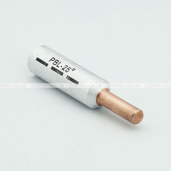 Тип наконечника: PBL шпиньовий мідно-алюмінієвий.Призначення: для окінцювання алюмінієвих проводів і кабелю, та їх підключення до електротехнічних пристроїв, які мають контактні групи з вузькими ввідними пазами.Матеріал: мідь, алюміній, контактна паста.Сертифікація в Україні: добровільна сертифікація (не підлягає обов'язковому декларуванню) згідно вимог ДСТУ EN 60947-1.Метод монтажу: обпресовування.Одиниця виміру: штука.Хвостова частина трубчастої форми, виготовлена з алюмінію.Контактна площинка виконана з міді і має в перерізі форму круглого шпиня.Мідна і алюмінієва частини з'єднані між собою методом контактного зварювання, що виключає виникнення нагріву в місці з'єднання.