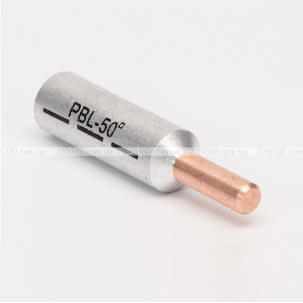 Тип наконечника: PBL шпиньовий мідно-алюмінієвий.Призначення: для окінцювання алюмінієвих проводів і кабелю, та їх підключення до електротехнічних пристроїв, які мають контактні групи з вузькими ввідними пазами.Матеріал: мідь, алюміній, контактна паста.Сертифікація в Україні: добровільна сертифікація (не підлягає обов'язковому декларуванню) згідно вимог ДСТУ EN 60947-1.Метод монтажу: обпресовування.Одиниця виміру: штука.Хвостова частина трубчастої форми, виготовлена з алюмінію.Контактна площинка виконана з міді і має в перерізі форму круглого шпиня.Мідна і алюмінієва частини з'єднані між собою методом контактного зварювання, що виключає виникнення нагріву в місці з'єднання.
