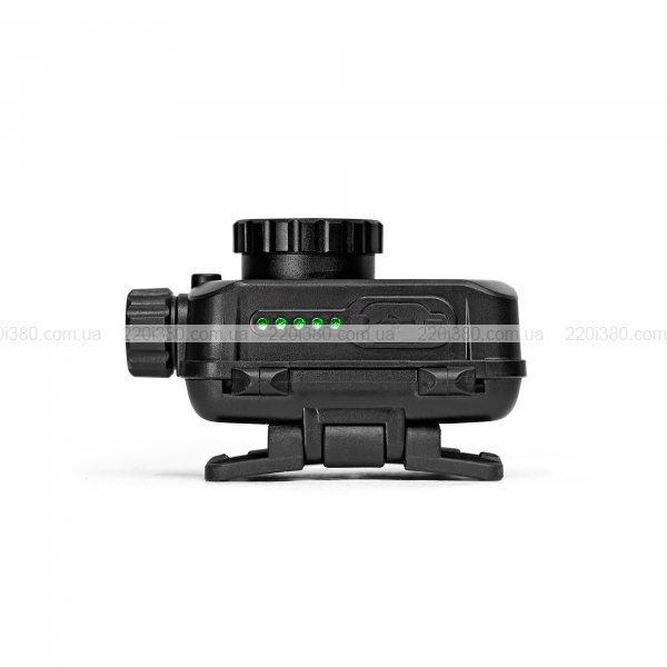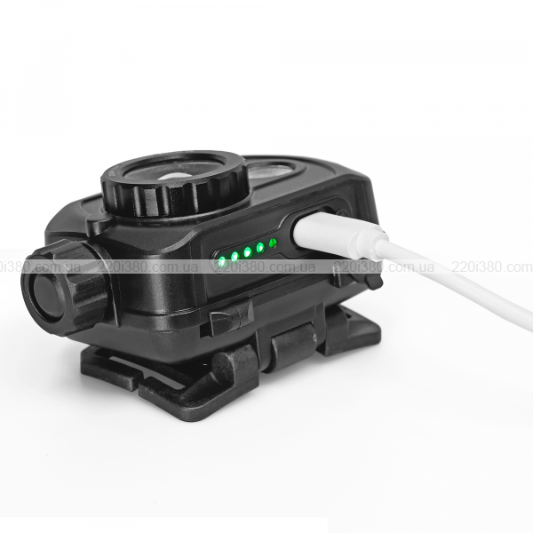 Заряджання ліхтарика здійснюється за допомогою зарядного кабелю USB-C, що постачається в комплекті. Щоб зарядити ліхтар, вимкніть його і зніміть захисну силіконову кришку. Підключіть кінець USB-A зарядного кабелю до зарядного пристрою, а інший кінець – до вхідного порту налобного ліхтаря. Під час заряджання поділки індикатора блиматимуть, відображаючи поточний рівень заряду батареї. Після повного заряджання всі поділки будуть постійно світитися. Після заряджання від’єднайте кабель і щільно закрийте захисну кришку, щоб запобігти потраплянню води та пилу всередину налобного ліхтаря. УВАГА! Категорично заборонено використовувати ліхтар під час заряджання.