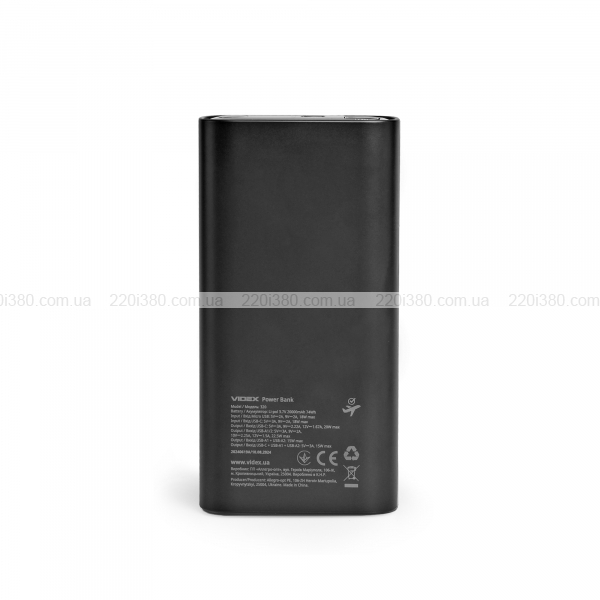 Повербанк VIDEX VPB-320 має ємність 20000mAh і максимальну вихідну потужність 22.5W. Цей акумулятор оснащений літій-полімерною батареєю 3.7V (74Wh), що дозволяє заряджати телефони, планшети, смарт-годинники та працювати бездротовим зарядкам з високою швидкістю завдяки підтримці технології Power Delivery (PD) до 20W. При натисненні кнопки на повербанку на LED-екрані відображається його поточний рівень заряду. Під час швидкої зарядки на дисплеї з'являється відповідний індикатор – «FAST».