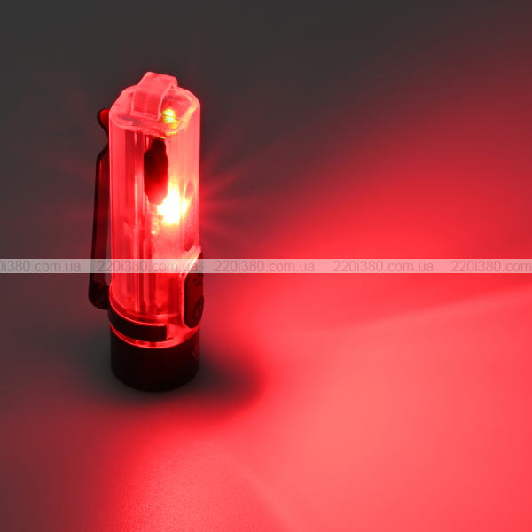 4. RED – режим ближнього червоного світла. Яскравість світла 9Lm. Дистанція освітлення налічує 5м. Тривалість роботи 1 год 30 хв. Інтенсивність світлового потоку 8cd.