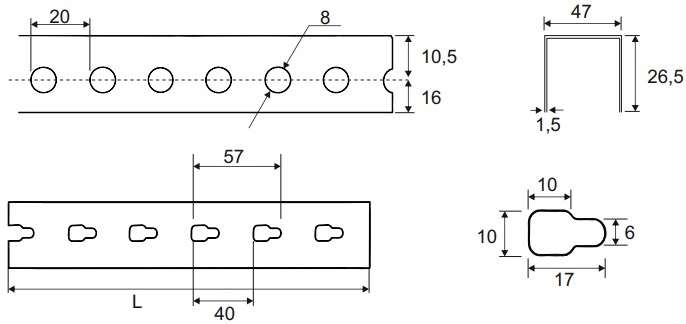 Профіль 1,5-500мм, П-подібний 47х26мм, перфорований, оцинкований - призначенний для монтажу систем для прокладання кабелю та створення опорних конструкцій.