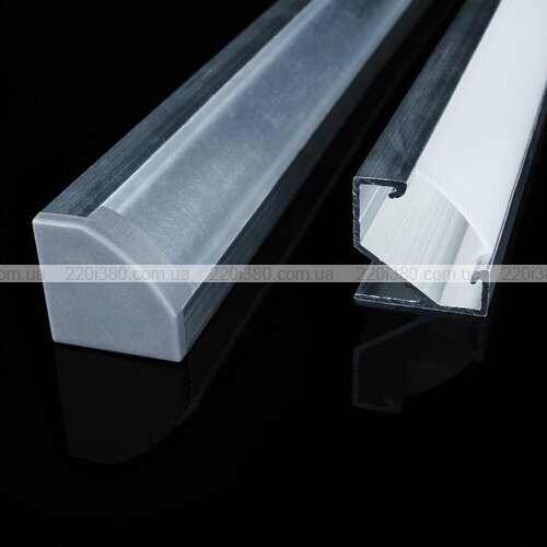 Профіль LED кутовий виготовлений з неанодованого алюмінію і призначений для освітлення невеликих площ. Унікальна конструкція замку забезпечує пиловологозахист системи за рахунок щільного прилягання розсіювача до профілю. Товщина стінок більше 1 мм і наявність додаткових ребер гарантує високу міцність готового виробу а також забезпечує необхідний тепловідвід від світлодіодної стрічки, тим самим значно збільшуючи термін її служби.