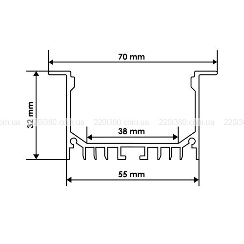 Даний широкий алюмінієвий профіль для світлодіодних стрічок має розміри 32х55 мм. Виріб являє собою прямий відрізок довжиною 2 метри. Профіль має анодоване покриття, що покращує його експлуатаційні характеристики. Для даної моделі передбачається врізний монтаж.