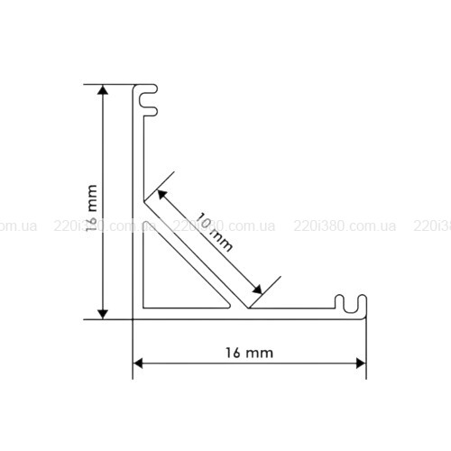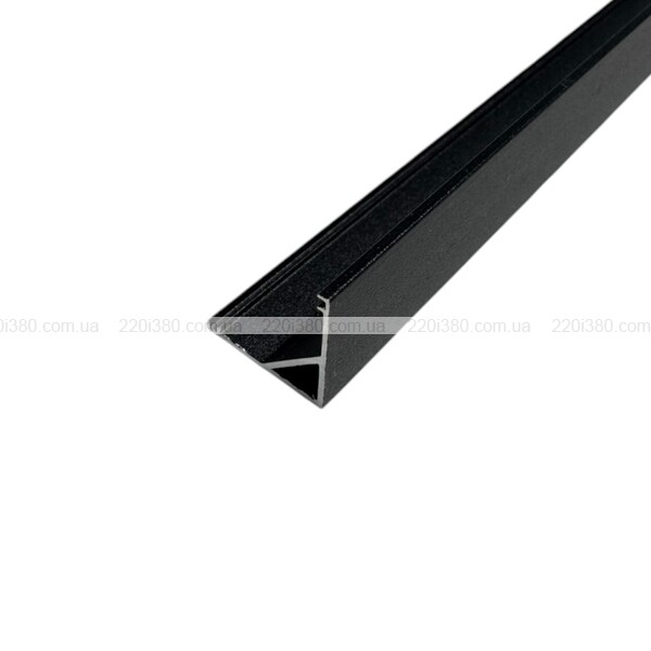 Цей профіль для світлодіодної стрічки виготовлений з алюмінію і розрахований на накладний монтаж. Конструкція моделі передбачає розміщення контуру підсвічування під кутом у 45°. Розміри сторін профілю – 16х16 мм. Виріб поставляється у вигляді відрізків довжиною 2 метри. Ця модель має покриття - чорний сатін.