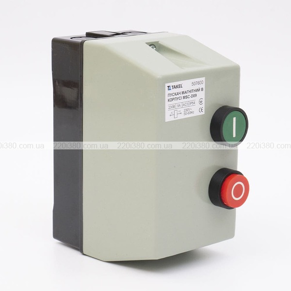 Пускачі в корпусі MSC тм Takel призначені для дистанційного керування (пуску та зупинки) трифазними асинхронними двигунами з короткозамкненими роторами, а також для захисту електродвигунів від перевантажень та надструмів, що виникають при проблемах стабільності роботи трифазних електричних кіл.Пускачі в корпусі MSC являють собою комплексні пристрої, в комплектацію яких входять:контактор малогабаритний типу KMI;теплове реле серії РТ;кнопки керування;корпус із ущільнювальними елементами.Пристрої, що входять до комплекту пускача, підключені до загальної схеми, і пускач у зборі вже готовий до роботи, як цілістний електротехнічний апарат.Сертифікація в Україні: декларування відповідності згідно вимог  ДСТУ EN 60947.