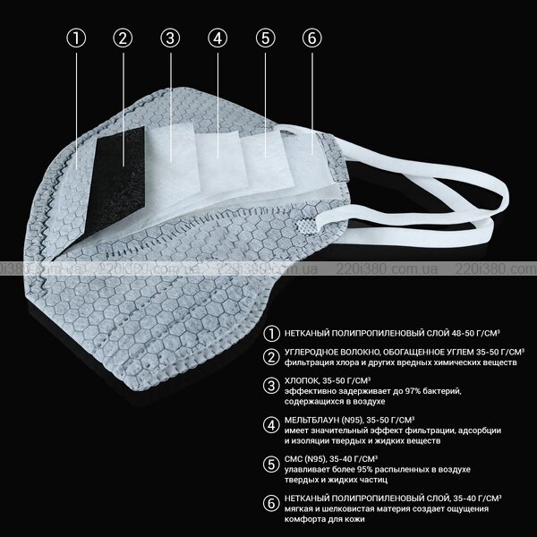 Дана модель маски-респіратора виконана у сірому кольорі та складається з шести окремих шарів. Багатошаровість забезпечує високу ступінь фільтрації (N95) та дозволяє ефективно захищати органи дихання людини від бактерій, рідин та твердих частинок, присутні у повітрі. За рахунок спеціального носового притискача досягається зручне та щільне прилягання виробу до обличчя.