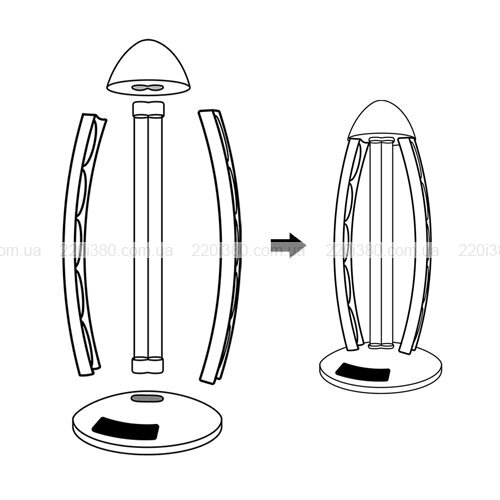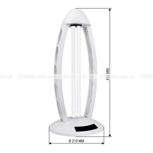 Світильник має потужність 38 Вт, що на 30% більше потужності моделей аналогічного форм-фактора. Висота виробу – 46 см, діаметр основи – 21 см. Завдяки тому, що світильник не потребує спеціального кріплення або настінного монтажу, кути розсіювання променів складають 360°. Ефективна площа дезінфекції приладу – 40-50 кв. м.