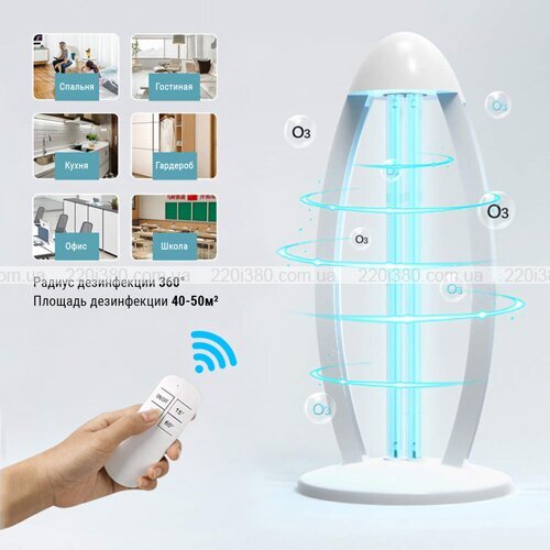 Світильник управляється за допомогою дистанційного пульта. Також споживач може запрограмувати час роботи пристрою, використовуючи функціонал таймера (15, 30 та 60 хвилин). Гарантійний термін роботи виробу – 12 місяців, розрахунковий ресурс стерилізаційної лампи – 8 тисяч годин.