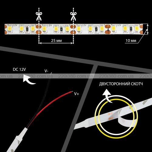 Енергоспоживання стрічки становить 9 Вт/м, кількість діодів у одному метрі – 120 шт. Колірна температура виробу – 6000-6500К, кути світіння – 120°. Термін служби стрічки оцінюється у 20 000 годин, а виробник дає гарантію на виріб 12 місяців.