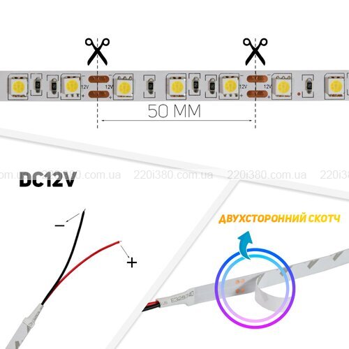 Енергоспоживання стрічки становить 14,4 Вт/м, кількість діодів у одному метрі – 60 шт. Колірна температура виробу – 2800-3200 К, кути світіння – 120°. Термін служби стрічки оцінюється у 20 000 годин, а виробник дає гарантію на виріб 12 місяців.