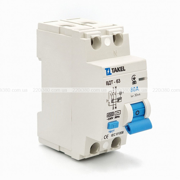 Вимикач диференційних струмів ВДТ-63 2Р 30мА 80А TAKEL