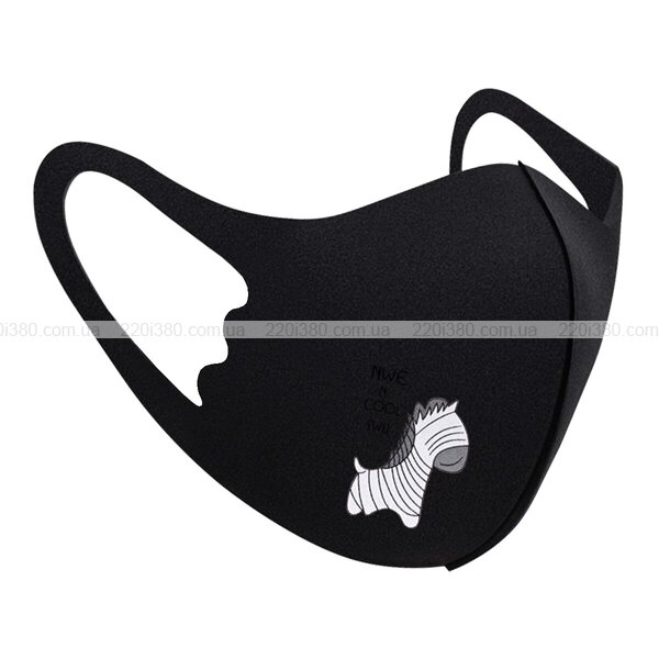 Щільне прилягання до обличчя досягається за рахунок анатомічної форми маски. Колір моделі – чорний, з нашивкою у вигляді фігурки зебри, розмір – дитячий.