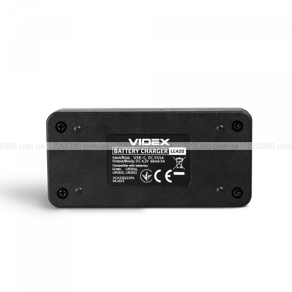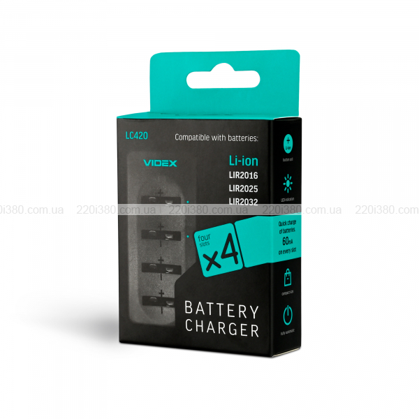 Зарядний пристрій Videx VCH-LC420 - призначений для багаторазового заряду літій-іонних (Li-ion) кнопкових акумуляторів, таких як LIR2016, LIR2025, LIR2032. Зарядний пристрій має чотири незалежних гнізда для заряду. Струм заряду визначається автоматично. Пристрій оснащено LED індикацією. Струм заряду 60мА, напруга заряду 4.2В.