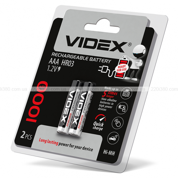 Нікель-метал-гідридні (Ni-MH) акумулятори VIDEX є високоякісним джерелом живлення і мають тривалий строк служби. Цей тип акумуляторів використовується в переносних електроприладах і інструментах. З переваг даного типу акумуляторів необхідно відзначити швидкий заряд і тривалий строк служби. Наявність на упаковці позначення "READY FOR USЕ", говорить про готовність акумулятора до роботи відразу після розпакування. У випадку відсутності такого позначення, перед початком використання акумулятор потрібно зарядити. Застосовуються для будь-яких типів навантаження.