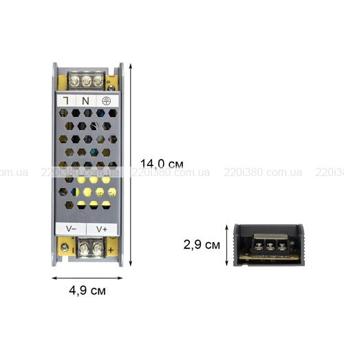 Підключення блоку живлення відбувається за допомогою 3 проводів на 220V (фаза, нуль, заземлення), а підключення споживача - за допомогою 2 проводів на 12V (+/-) для подачі напруги, наприклад на світлодіодну стрічку.