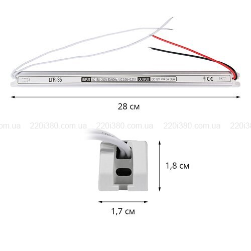 Блок живлення OEM LTR-36 відноситься до серії стік-моделей, які призначені для максимально непомітного використання в інтер'єрі. При невеликій ширині і товщині (17 та 18 мм, відповідно), блок живлення має довжину 28 см. Дані вироби активно застосовуються при монтажі світлодіодних стрічок на стелях та у підсвічуванні дзеркал. Блок живлення розрахований на потужність в 36 Вт і працює від змінного струму з напругою 176-265 В. На виході вироби споживач отримує 12 В постійного струму з силою 3 А. Блок живлення має клас захисту IP20 і належить до групи якості «Стандарт». Виробником передбачено виключно пасивне охолодження апарату: корпус виробу виконаний з алюмінію, який добре проводить тепло.
