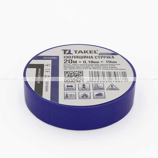 Ізоляційна стрічка 0.18мм х 19мм х 20м Argent, блакитний TAKEL