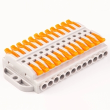 Корпус клем виготовлений із пластику, а контактна частина: із лудженої латуні, монтаж не вимагає використання інструментів.Побокам клеми є майданчики з двома отворами під шуруп, болт або цвях для закріплення на плоскій поверхні.Низький перегрів під час пропускання номінальних струмів.Покращена струмова провідність затискачів за рахунок збільшення обсягу металу, що використовується.Спеціальний технологічний отвір на корпусі клеми призначений для перевірки з'єднання тестером-пробником або щупом мультиметра.Для монтажу клеми сполучного проводиться попередня підготовка дротів, що полягає в зачистці кінця дроту від ізоляції на довжину 10 мм. Фіксація дроту усередині клеми проводиться за рахунок пружинного затискного механізму. Для цього потрібно підняти важіль, встановити провід усередині клеми та опустити важіль. Сполучна клема СМК багаторазова, і дозволяє багаторазово проводити монтаж та демонтаж дроту без його пошкодження.