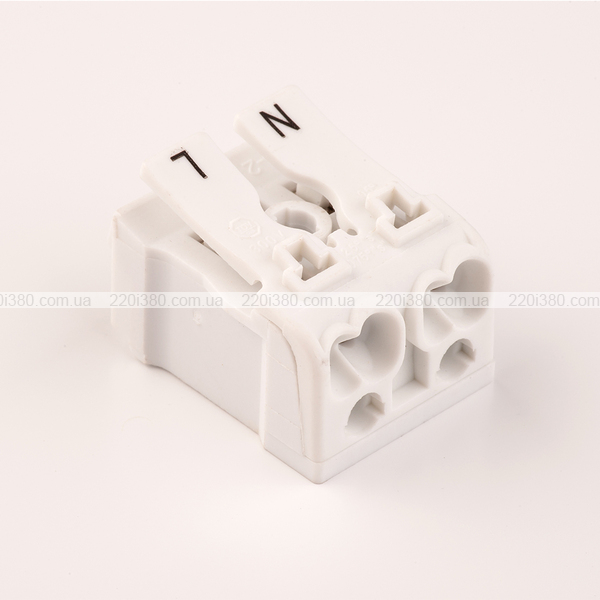 Від двох до п'яти отворів (заатискачів) в одному корпусі.Кожна клема має маркування (фаза, нуль, земля) на рухомій частині для