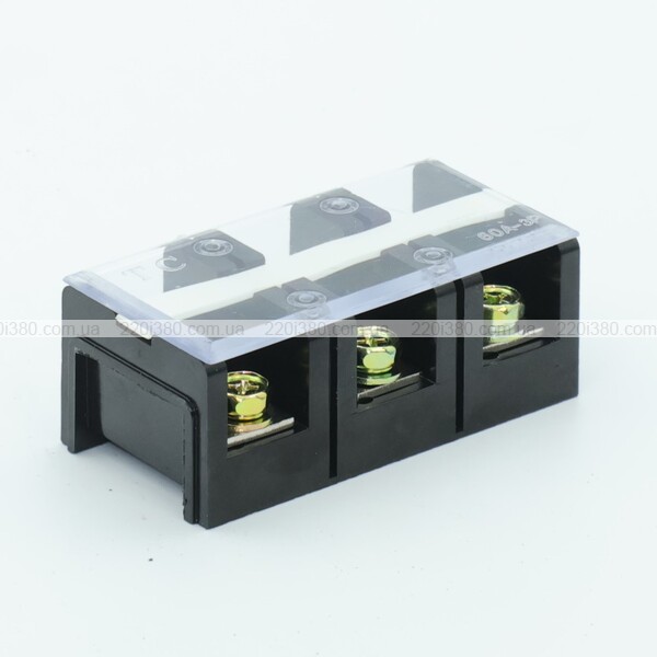 | Матеріал: | Клемна шина: латунь; Гвинти: анодована сталь; Корпус: карболіт; Кришка: ПВХ |