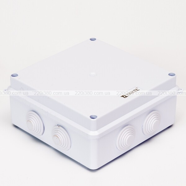Призначення: для з'єднання і розгалуження електричних проводів і кабелю в умовах зовнішнього монтажу. Матеріал: АБС-пластик, ПВХ. Одиниця виміру (мін. норма відвантаження): штука. Робочі температури: від -30 до +60 °С. Температури монтажу: від -10 до +40 °С. Колір: світло-сірий. Якісний матеріал (АБС), стійкий до перепадів температур та інших впливів навколишнього середовища, забезпечує тривалий термін експлуатації коробки. М'які багаторівневі вводи-сальники з щільною посадкою в отвори збільшують ступінь герметизації внутрішнього простору коробки. Сальники міцно тримаються в отворах, люфт відсутній. Кожен ввід має п'ять варіантів діаметра отвору. Матеріал сальників залишається пластичним тривалий час. Ущільнювальна гумка між корпусом і кришкою по всьому периметру коробки значно збільшує ступінь пило і волого захисту.Кришка фіксується до корпусу коробки за допомогою засувок, що забезпечує простий і швидкий монтаж. Коробка має невеликі зовнішні виступи на дні нижньої частини корпусу для дистанціювання від поверхні, до якої вони монтуються. Спеціальні виступи на внутрішній поверхні дна коробки, до яких можна прикручувати клемні колодки або шини нульові. Коробка поставляється в індивідуальній упаковці (полімерна плівка), що допомагає забезпечити належний зовнішній вигляд виробу до моменту установлення.