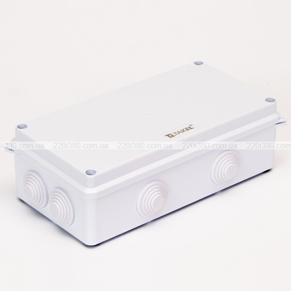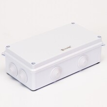 Призначення: для з'єднання і розгалуження електричних проводів і кабелю в умовах зовнішнього монтажу. Матеріал: АБС-пластик, ПВХ. Одиниця виміру (мін. норма відвантаження): штука. Робочі температури: від -30 до +60 °С. Температури монтажу: від -10 до +40 °С. Колір: світло-сірий. Якісний матеріал (АБС), стійкий до перепадів температур та інших впливів навколишнього середовища, забезпечує тривалий термін експлуатації коробки. М'які багаторівневі вводи-сальники з щільною посадкою в отвори збільшують ступінь герметизації внутрішнього простору коробки. Сальники міцно тримаються в отворах, люфт відсутній. Кожен ввід має п'ять варіантів діаметра отвору. Матеріал сальників залишається пластичним тривалий час. Ущільнювальна гумка між корпусом і кришкою по всьому периметру коробки значно збільшує ступінь пило і волого захисту.Кришка фіксується до корпусу коробки за допомогою засувок, що забезпечує простий і швидкий монтаж. Коробка має невеликі зовнішні виступи на дні нижньої частини корпусу для дистанціювання від поверхні, до якої вони монтуються. Спеціальні виступи на внутрішній поверхні дна коробки, до яких можна прикручувати клемні колодки або шини нульові. Коробка поставляється в індивідуальній упаковці (полімерна плівка), що допомагає забезпечити належний зовнішній вигляд виробу до моменту установлення.