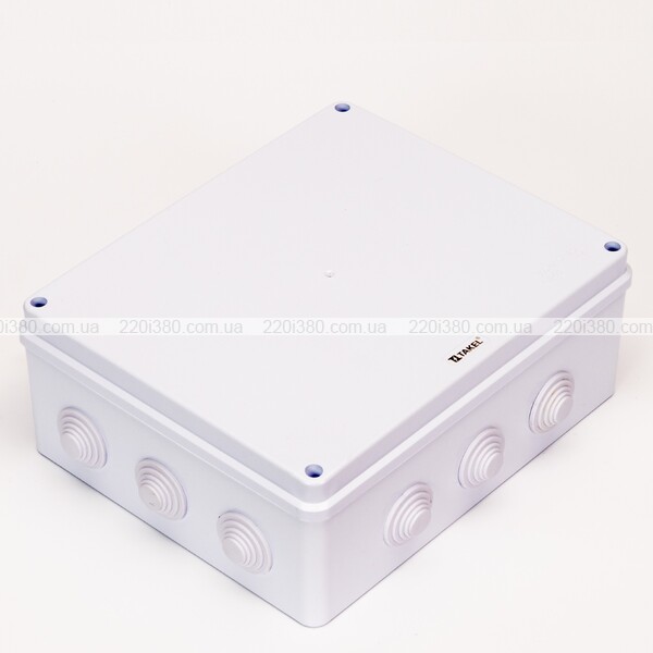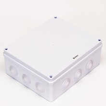 Призначення: для з'єднання і розгалуження електричних проводів і кабелю в умовах зовнішнього монтажу. Матеріал: АБС-пластик, ПВХ. Одиниця виміру (мін. норма відвантаження): штука. Робочі температури: від -30 до +60 °С. Температури монтажу: від -10 до +40 °С. Колір: світло-сірий. Якісний матеріал (АБС), стійкий до перепадів температур та інших впливів навколишнього середовища, забезпечує тривалий термін експлуатації коробки. М'які багаторівневі вводи-сальники з щільною посадкою в отвори збільшують ступінь герметизації внутрішнього простору коробки. Сальники міцно тримаються в отворах, люфт відсутній. Кожен ввід має п'ять варіантів діаметра отвору. Матеріал сальників залишається пластичним тривалий час. Ущільнювальна гумка між корпусом і кришкою по всьому периметру коробки значно збільшує ступінь пило і волого захисту.Кришка фіксується до корпусу коробки за допомогою засувок, що забезпечує простий і швидкий монтаж. Коробка має невеликі зовнішні виступи на дні нижньої частини корпусу для дистанціювання від поверхні, до якої вони монтуються. Спеціальні виступи на внутрішній поверхні дна коробки, до яких можна прикручувати клемні колодки або шини нульові. Коробка поставляється в індивідуальній упаковці (полімерна плівка), що допомагає забезпечити належний зовнішній вигляд виробу до моменту установлення.