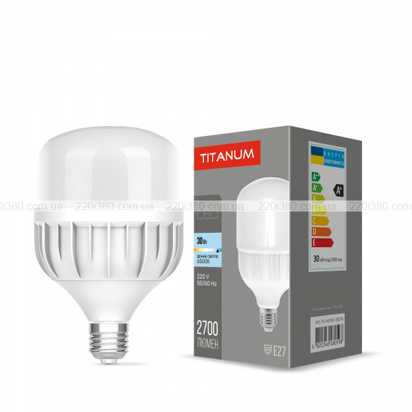 Лампа не перегрівається та здатна виробляти рівне яскраве світло без мерехтіння протягом тривалого періоду часу. Колірна температура - 6500К (денне світло). Кут розсіювання світла - 220°, що дозволяє якісно освітити приміщення. Лампа має світловіддачу - 90Лм/Вт. Сумарна сила світлового потоку у лампи TITANUM становить 2700Лм. Освітлювальний прилад обладнаний світлодіодами, які дають направлене світло, що є хорошою альтернативою лампам розжарювання великої потужності.