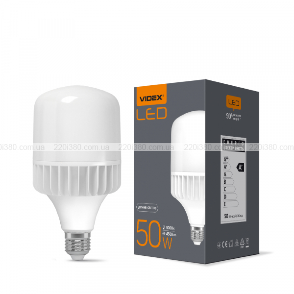Лампа не перегрівається та здатна виробляти рівне яскраве світло без мерехтіння протягом тривалого періоду часу. Колірна температура - 5000К (максимально наближений до денного світла). Кут розсіювання світла - 200°, що дозволяє якісно освітити приміщення. Лампа має світловіддачу - 90Лм/Вт. Сумарна сила світлового потоку у лампи VIDEX становить 4500Лм. Освітлювальний прилад обладнаний світлодіодами, які дають направлене світло, що є хорошою альтернативою лампам розжарювання великої потужності.