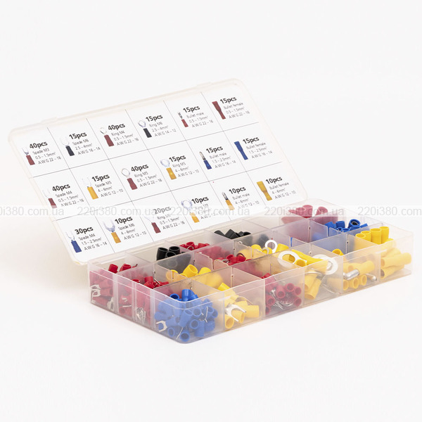 Комплектація набору:18 видів накінечників:Наконечники вилкові з ізоляцією серії SVSV 1,25-3 (червоний)- 40шт.SV 1,25-4  (червоний)- 40шт.SV 2-4 (синій)- 30шт.SV 3,5-6 (чорний)- 15шт.SV 5,5-5 (жовтий)- 15шт.SV 5,5-6 (жовтий)- 10шт.Наконечники кільцеві з ізоляцією серії RVRV 1,25-4 (червоний)- 40 шт.RV 1,25-5 (червоний)- 40 шт.RV 1,25-6 (червоний)- 20 шт.RV 3,5-6 (чорний)- 15 шт.RV 5,5-5  (жовтий)- 15 шт.RV 5,5-8  (жовтий)- 15 шт.Конектори круглі з ізоляцією серій FPD і MPDMPD 1.25 тато (червоний)- 15 шт.FPD 1.25  мама (червоний)- 15 шт.MPD 2 тато (синій)- 15 шт.FPD 2  мама (синій)- 15 шт.MPD 5.5 тато (жовтий)- 10 шт.FPD 5.5  мама (жовтий)- 10 шт.