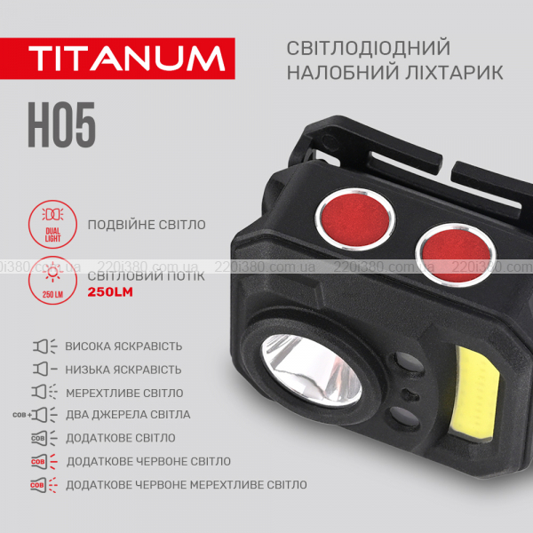 Налобний світлодіодний ліхтарик TITANUM TLF-H05 250Лм 6500K має компактні розміри та зручний і м’який за структурою налобний ремінь, який забезпечує комфорт під час тривалого носіння. В ліхтарик вбудований акумулятор. Має найбільшу популярність у застосуванні серед туристів, велосипедистів, риболовів та мисливців. Особливістю даної моделі є наявність датчика сенсора, що дозволяє керувати ліхтариком за допомогою жестів. Також ліхтарик має механізм нахилу, який дозволяє регулювати кут освітлення.