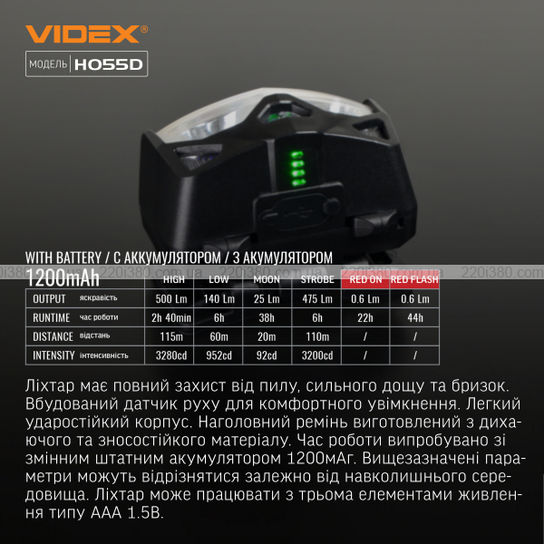 | Комплектація: | Наголовний ремінь, акумулятор Li-ion VLF-B12 1200mAh або 3x AAA змінний, зарядний кабель, документація |