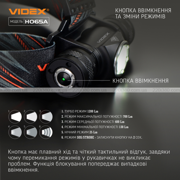 | Режим роботи: | Турбо, максимум, средний, низкий, ночной, SOS |