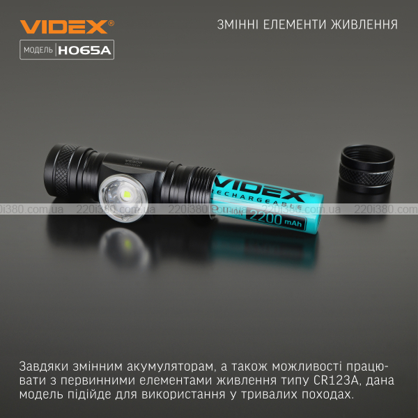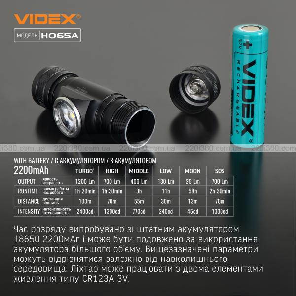 | Тип акумулятора: | Li-ion 1х 18650 2200mAh або 2х CR123A змінний |