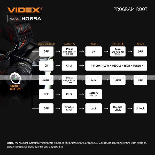 LOW (Режим мінімальної потужності світла) – яскравість світла 130Lm. Дистанція висвітлення налічує 30м. Тривалість роботи 11год. Інтенсивність світлового потоку 240cd.