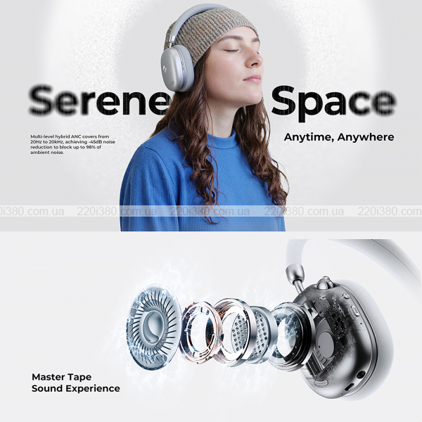 Щоб увійти в режим активного шумопоглинання, короткочасно натисніть кнопку ANC. Завдяки технології активного шумозаглушення - показник глибини зменшення шуму становить -45дБ, завдяки чому ви можете насолоджуватись улюбленою музикою в умовах гучного міста. При використанні режиму заглушення навколишнього середовища ви будете вловлювати більш чітко людські голоси. Щоб увійти в режим адаптивного шумопоглинання натисніть ще двічі кнопку ANC.