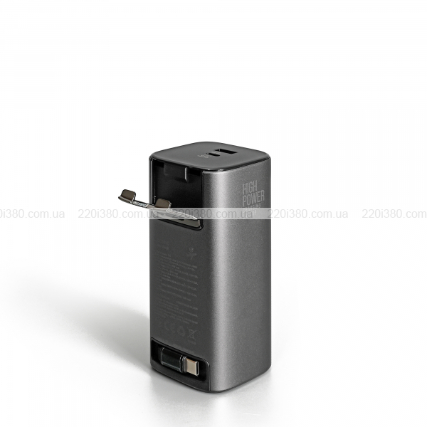 Повербанк має роз’єм USB-C, USB-A та вбудований USB-C кабель, який легко витягується і так само складається. Роз’єм кабелю має магнітну основу, завдяки чому наконечник при складанні легко прикріплюється до корпусу, чим забезпечує охайний вигляд та компактність.