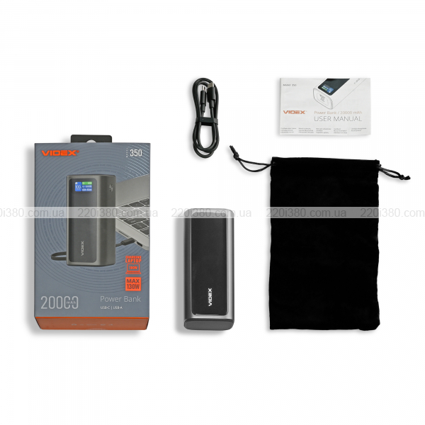 Power Bank VIDEX VPB-350 20000mAh 130W – повербанк з високою потужністю і надшвидкою зарядкою. Ємність становить 20000mAh, а максимальна вихідна потужність - 130W. Акумулятор оснащений літій-іонною батареєю 3.7V 74Wh, що дозволяє заряджати телефони, ноутбуки, планшети та інші гаджети з високою швидкістю завдяки підтримці технології Power Delivery (PD) до 100W.