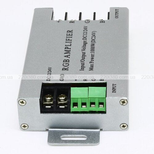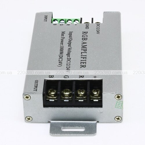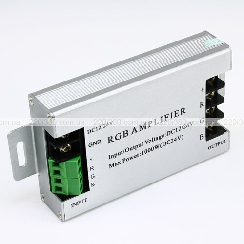 Підсилювач RGB OEM AMP 30А m застосовується для посилення сигналу, що йде до багатоколірної світлодіодної стрічки. Виріб розрахований на максимальну потужність 360 Вт та вихідну силу струму 30 А. На кожен з трьох каналів приладу доводиться по 10 А. Робоча напруга моделі – 12 В.