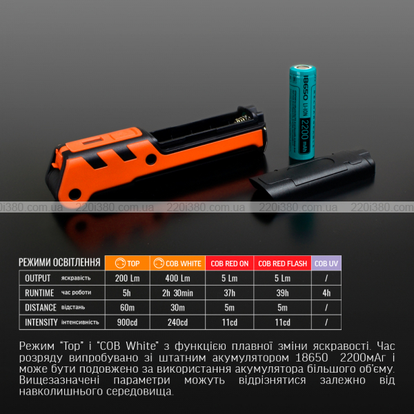 - Коротке натискання кнопки "ON/OFF" – вмикання світла, перемикання між режимами «Top» і «COB White» та вимикання світла.